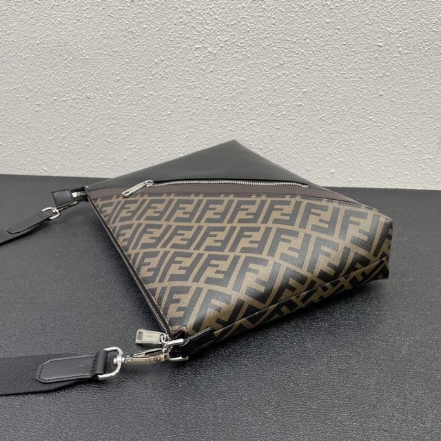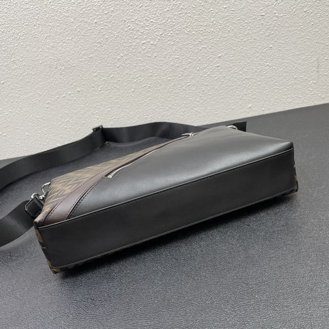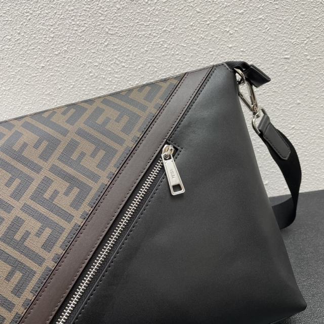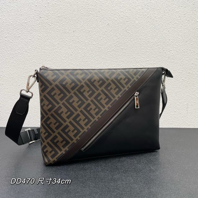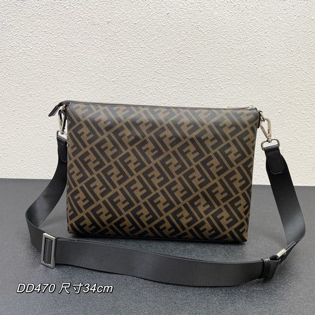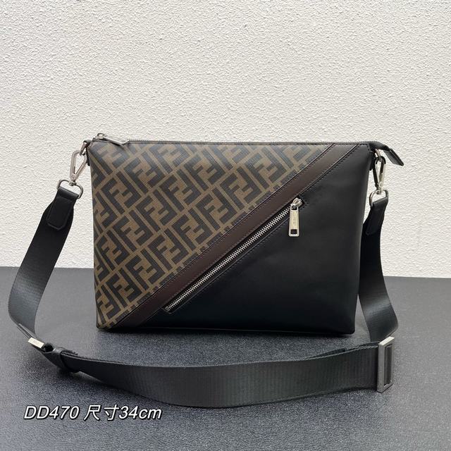 修长款信差包配有拉链中间隔层,拉链内袋。肩带可调节可拆卸。饰有FF图案,黄色细节镶饰。DD 470 尺寸34..25..5.5 CM