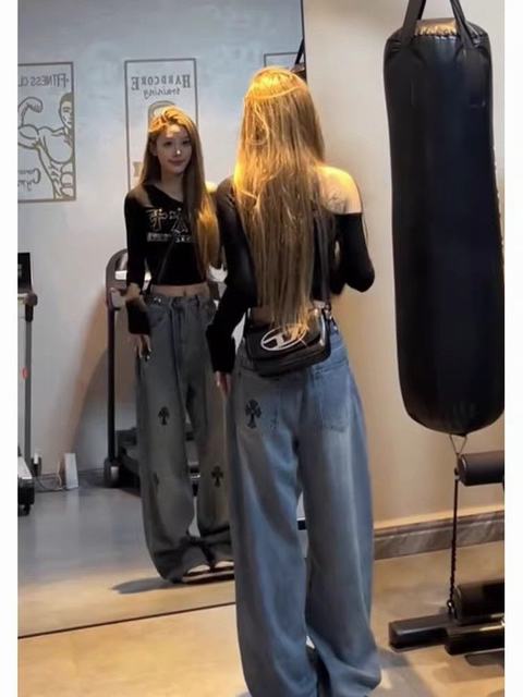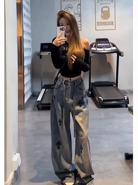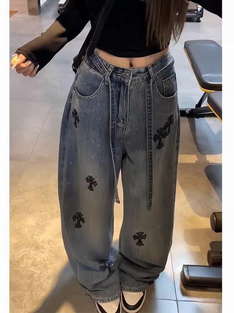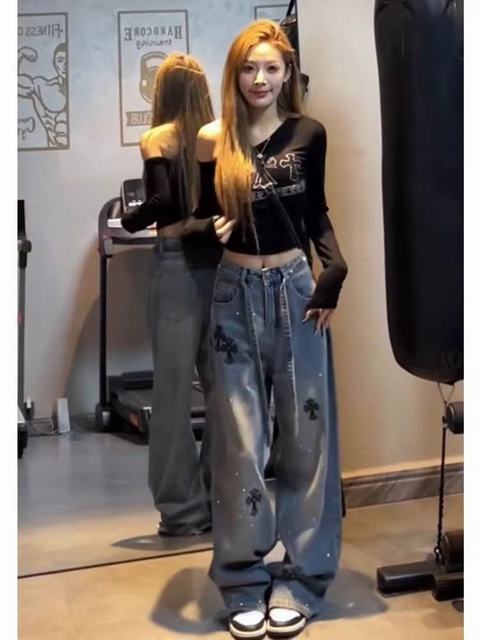 美式2025年秋季新款燙鉆滿天星十字架直筒牛仔褲女高腰顯瘦闊腿褲