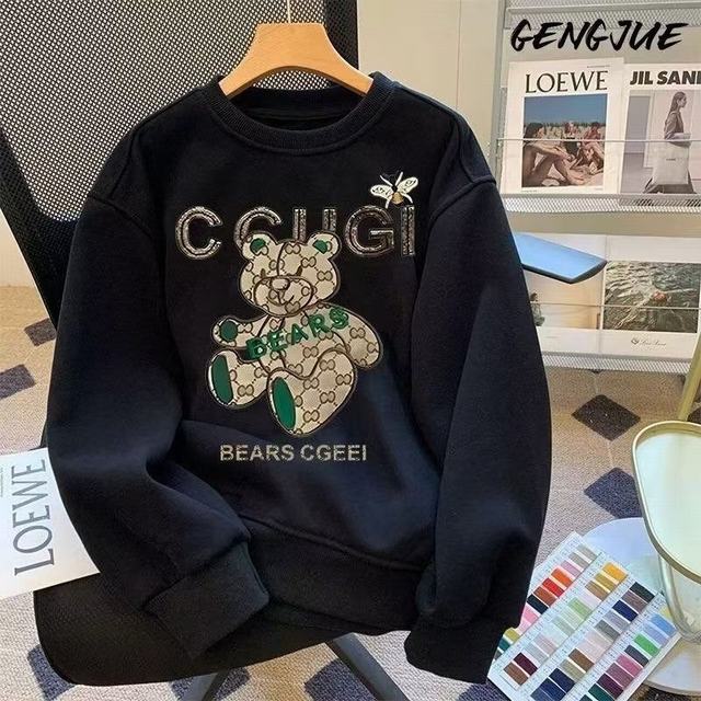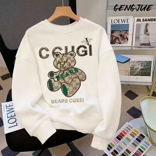 歐美輕奢休閑衛衣男秋季新款潮牌寬松小熊印花長袖男重磅圓領上衣