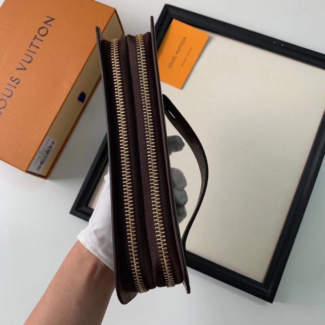 款號:M2012!LV男士雙拉手包【尺寸】21.11.5 這款精巧的Monogram帆布雙拉錢夾,設計實用寬敞,可放信用卡、證件、零錢、紙幣、 支票簿和筆。拉鏈開合,拉鏈零錢隔層,可放票據和護照,閃亮的金色金屬配件。