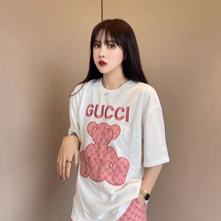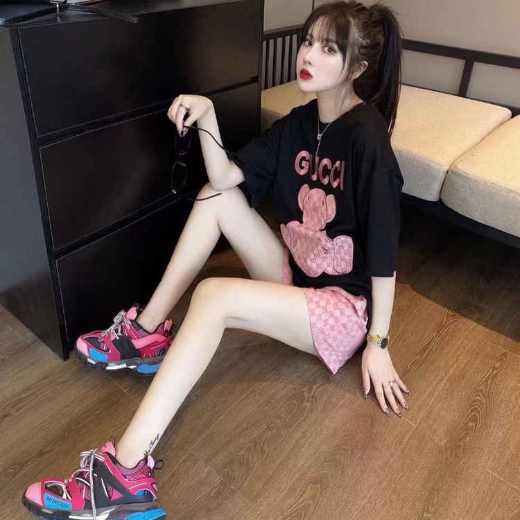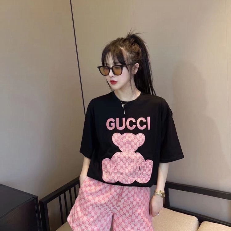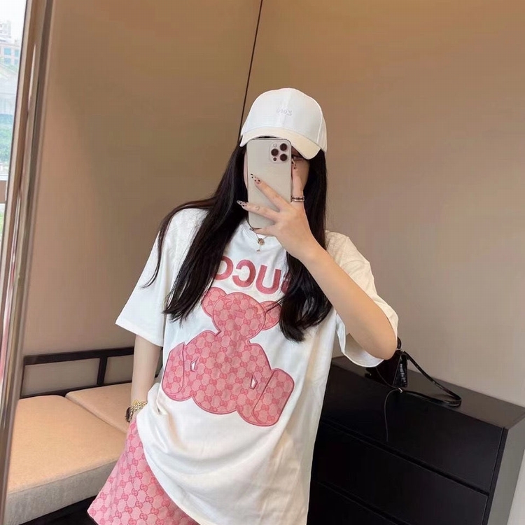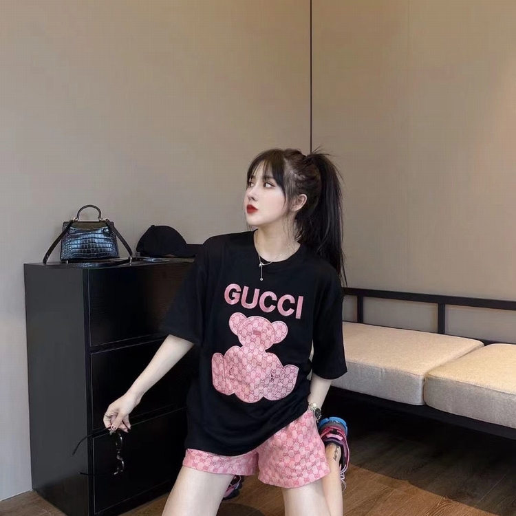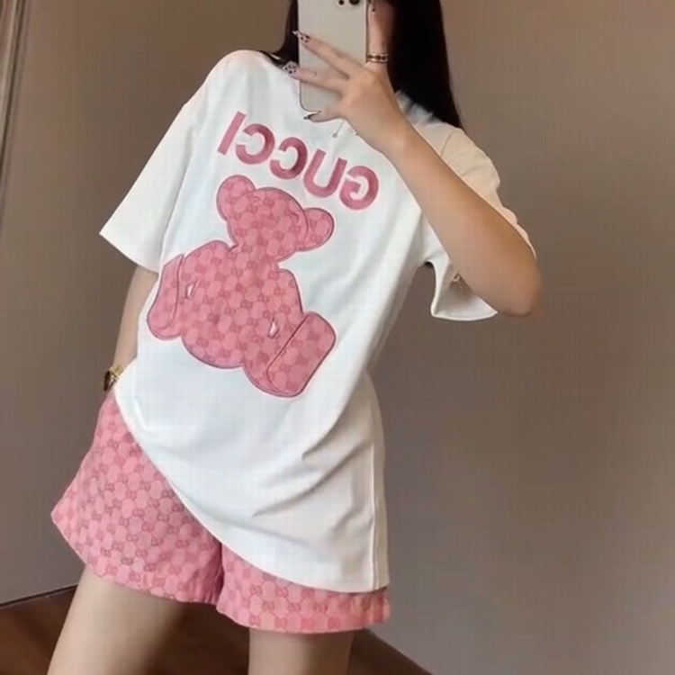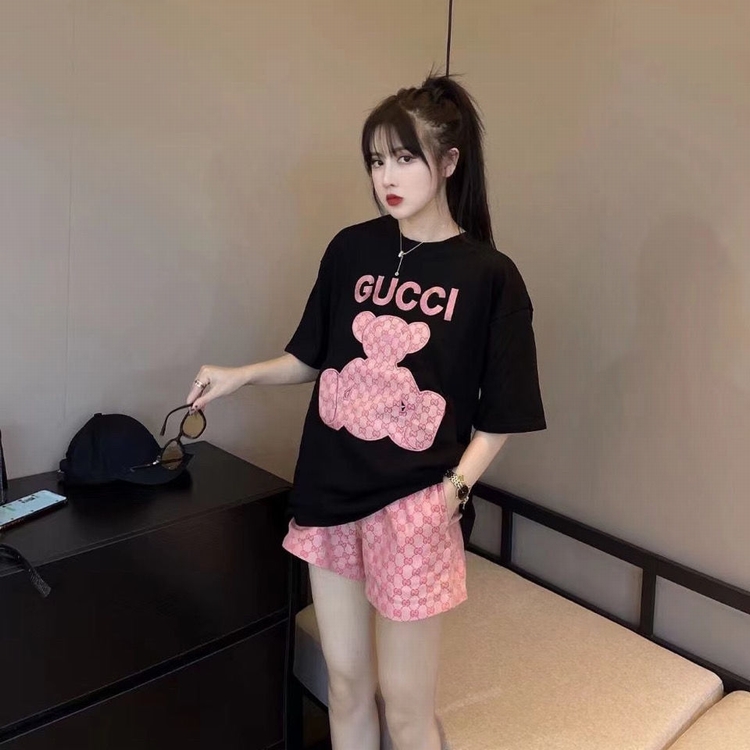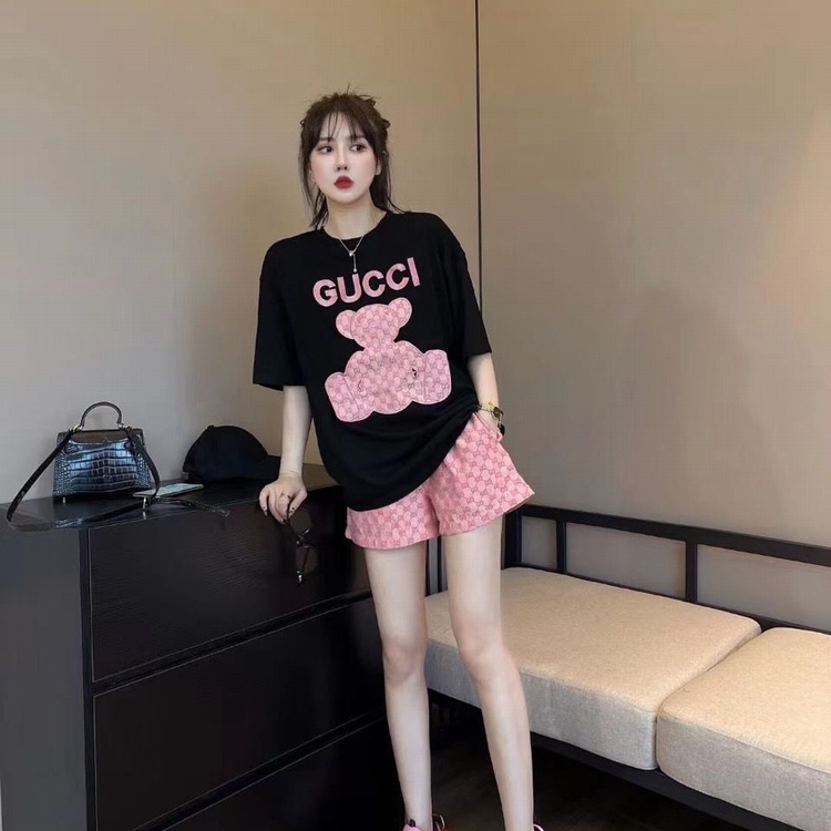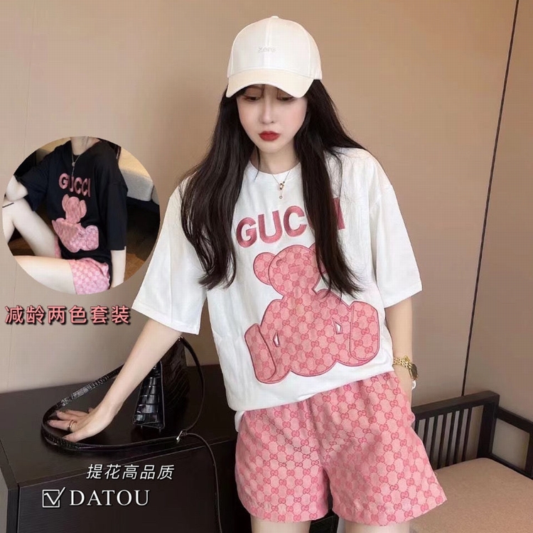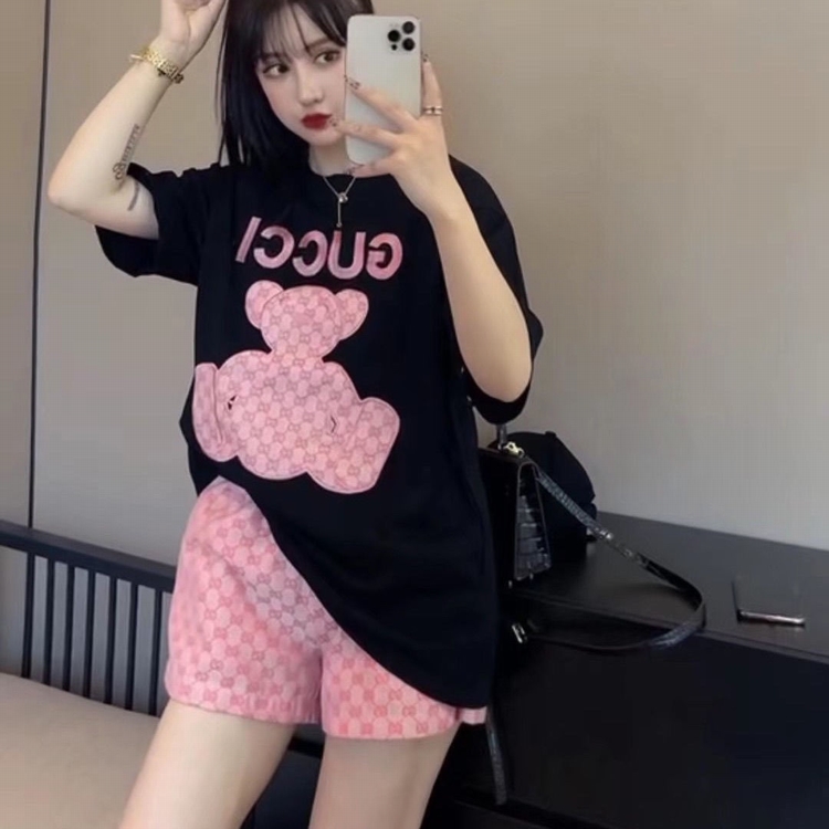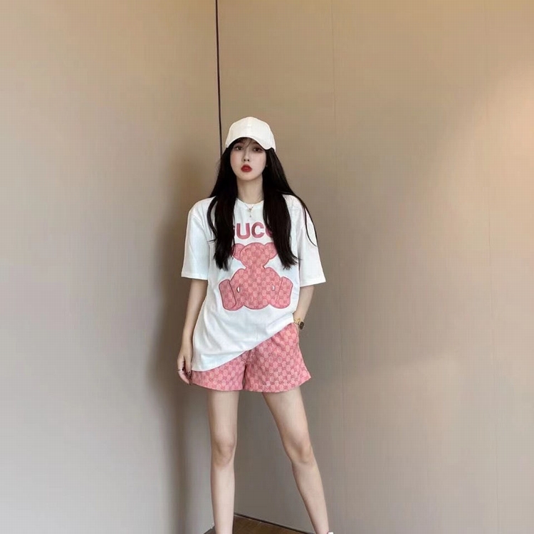 歐貨G家短褲套裝 粉色小熊貼布刺繡短袖雙g提花闊腿短褲潮牌網紅