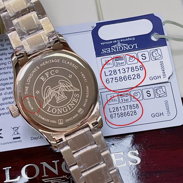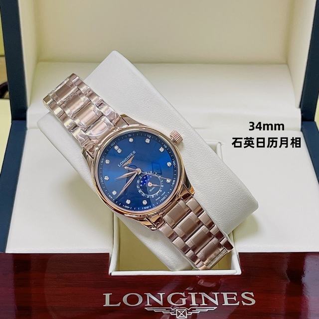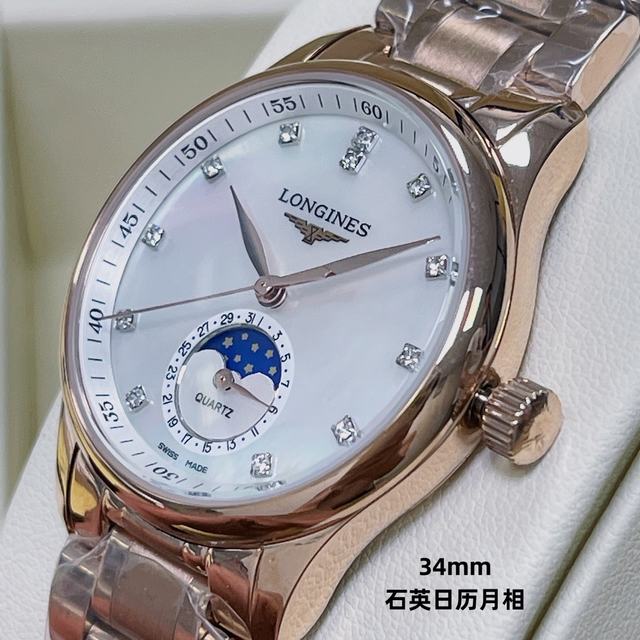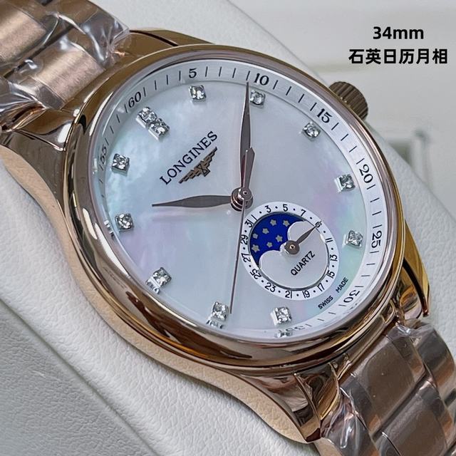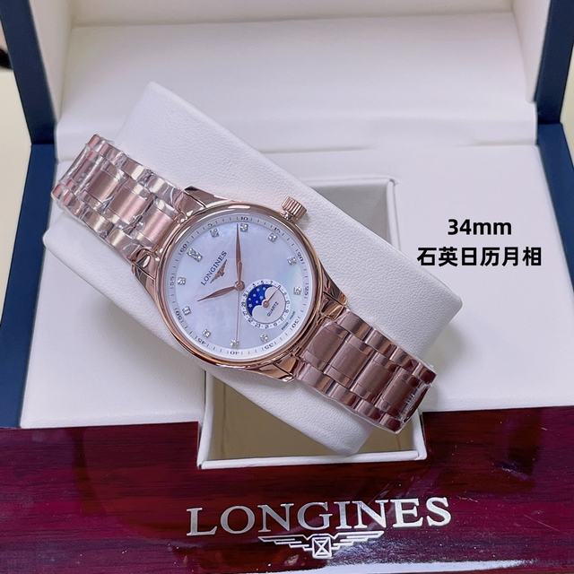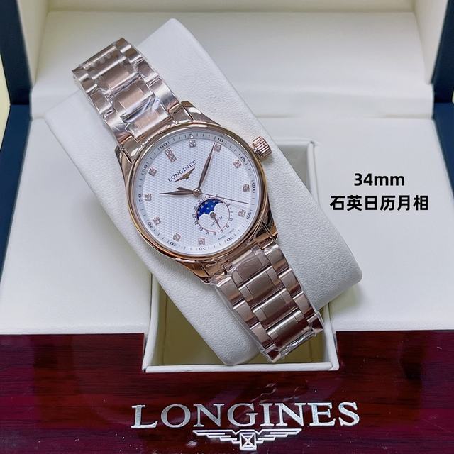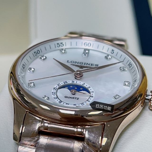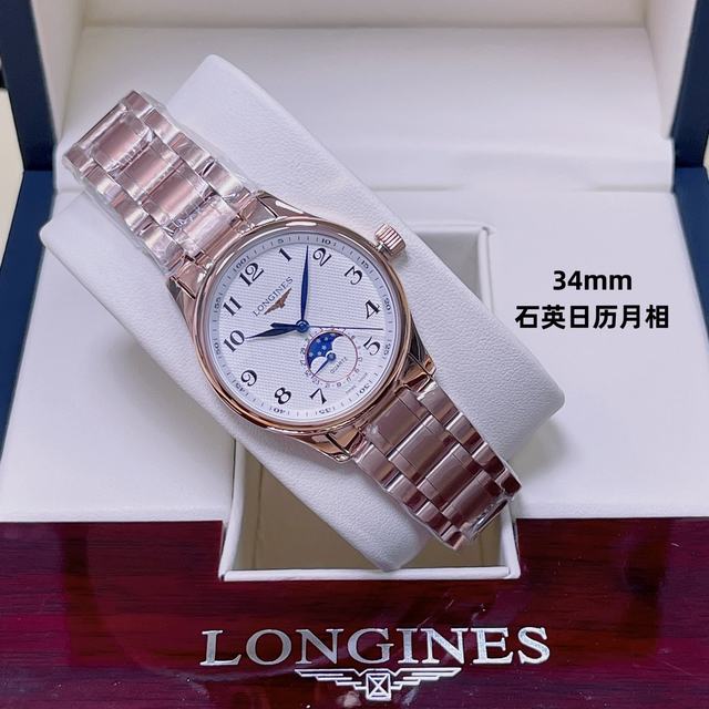 【趙麗穎同款】Longines浪琴 名匠系列女士腕表。鋼帶皮帶統一價格。520金➕20。全新浪琴名匠月相腕表系列。 詮釋女性高貴典雅。精鋼表殼直徑:34毫米尺寸。官方一致6字位月相1-31日期顯示功能。進口石英機芯。三碼合一。採用進口頭層牛皮、原裝蝴蝶扣。珍珠母貝表盤在女表中是運用較多的元素,浪琴為其搭配了12顆鑽石時標,將女性魅力發揮到極致。盤面6點鐘位置的小表盤顯示月相和日期,兼顧實用性和浪漫感,精巧別緻。字表盤掃瞄打版,顏色、「麥粒」格紋深淺、內影字體大小粗細與正品完全一致。 三碼合一認準編號67586628 號碼063520