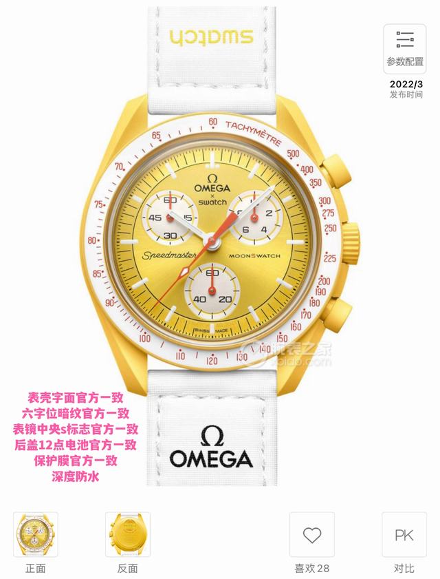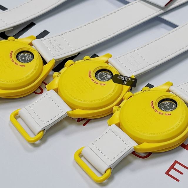 欧米茄swatch联名款式1号 太阳款 黄色 认准品质。价格实惠。SWATCH斯沃琪️OMEGA欧米茄联名款以精致的阳光拉丝设计表盘搭配白色 VELCRO 表带,仿佛笼罩在金色色阳光之中。小表盘指针和测速刻度,增添其阳光气质。表壳字面官方一致。六字位暗纹方官方一致。表镜中央s官方一致。后盖12点电池官方一致。深度防水。保护膜官方一致。高强夜光。所有表盘均饰有 OMEGA X SWATCH 品牌标志、经典的 Speedmaster 标志和全新 MoonSwatch 标志。所有表款均采用剔透玻璃材质,Bioceramic 材质带来别致的细腻触感。表盘外圈和小表盘饰以精致圆形图案,时尚夺目的表耳结构,测速刻度表圈上点缀标志性“dot over 90”细节,细微之处体现高品质。所有时针、分针、计时秒针和时标均覆以 Super-LumiNova 夜光涂层,身处黑暗亦能清晰读时。