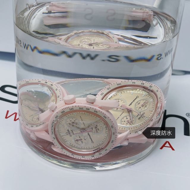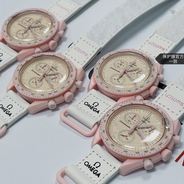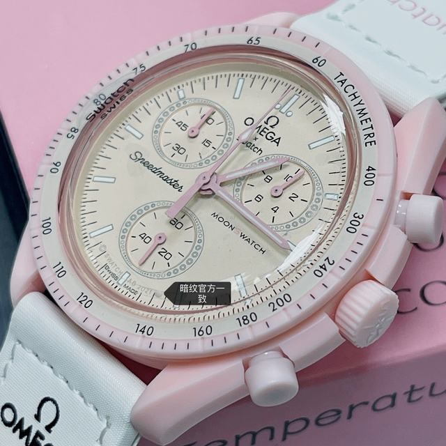 欧米茄swatch联名款式3号 金星款 粉色。认准品质。价格实惠。SWATCH斯沃琪️OMEGA欧米茄联名款这款手表设计如此醒目,白色 VELCRO 表带与柔和淡粉色调完美调和。椭圆形小表盘的边缘点缀钻石般的璀璨细节,增添一丝女性的优雅气息。时针、分针、计时秒针和计数针均以粉色呈现。 表壳字面官方一致。六字位暗纹官方一致。表镜中央s官方一致。后盖12点电池官方一致。深度防水。保护膜官方一致。高强夜光。所有表盘均饰有 OMEGA X SWATCH 品牌标志、经典的 Speedmaster 标志和全新 MoonSwatch 标志。所有表款均采用剔透玻璃材质,Bioceramic 材质带来别致的细腻触感。表盘外圈和小表盘饰以精致圆形图案,时尚夺目的表耳结构,测速刻度表圈上点缀标志性“dot over 90”细节,细微之处体现高品质。所有时针、分针、计时秒针和时标均覆以 Super-LumiNova 夜光涂层,身处黑暗亦能清晰读时。