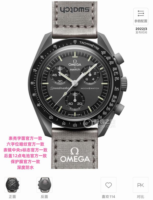 欧米茄swatch联名款式2号水星黑色。认准品质。价格实惠。SWATCH斯沃琪️OMEGA欧米茄联名款浓烈深灰色和金属灰 VELCRO 表带设计,十足商务气息。计时秒针、小表盘指针和测速刻度均以白色呈现。 表壳字面官方一致。六字位暗纹官方一致。表镜中央s官方一致。后盖12点电池官方一致。深度防水。保护膜官方一致。高强夜光。所有表盘均饰有 OMEGA X SWATCH 品牌标志、经典的 Speedmaster 标志和全新 MoonSwatch 标志。所有表款均采用剔透玻璃材质,Bioceramic 材质带来别致的细腻触感。表盘外圈和小表盘饰以精致圆形图案,时尚夺目的表耳结构,测速刻度表圈上点缀标志性“dot over 90”细节,细微之处体现高品质。所有时针、分针、计时秒针和时标均覆以 Super-LumiNova 夜光涂层,身处黑暗亦能清晰读时。