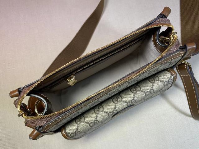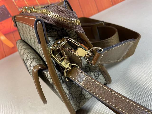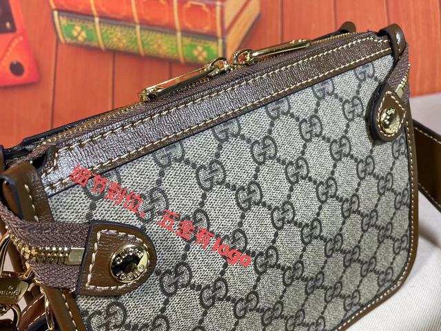 Gucci meo vintage 爆款,斜挎包在无边序曲系列中脱颖而出,在复古格调中注入现代设计精髓。迷你手袋装饰椭圆形皮革标签,搭配品牌标志性元素猫科动物头像.品牌的经典元素都集于一身,经典复古还如此百搭可爱。款号:674164。尺寸:21x16.5x8cm。颜色:啡棕pvc。 号码b062360