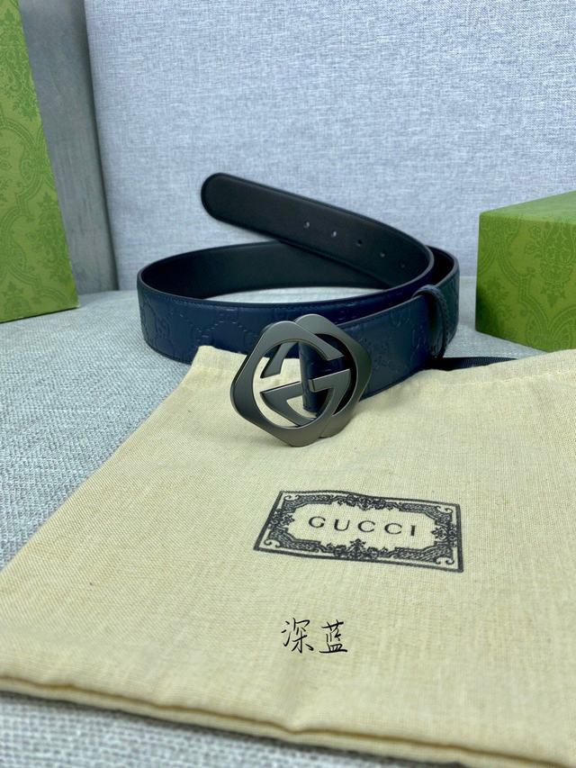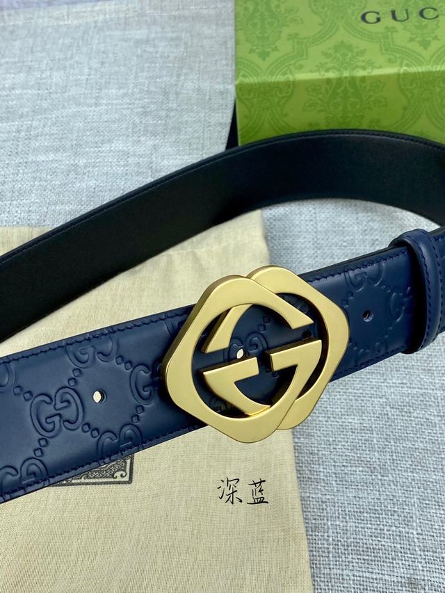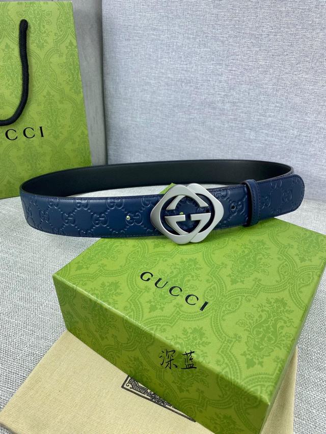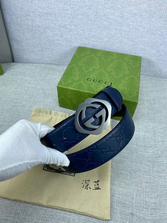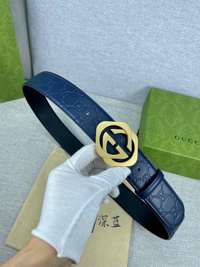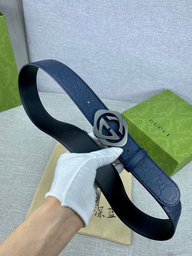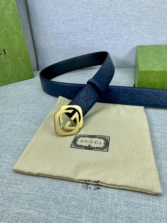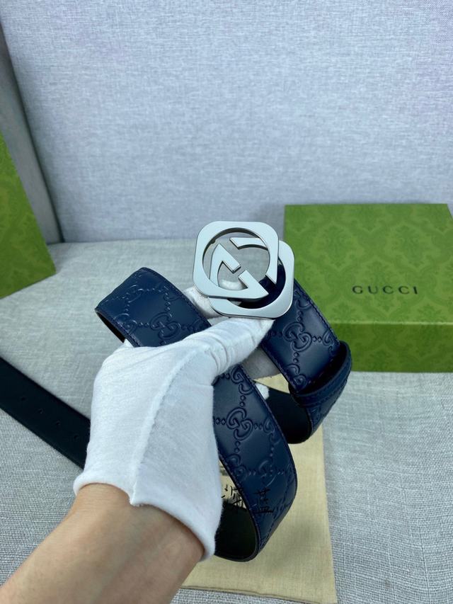 配全套包裝 寬度4.0cm GUCCI 互扣式雙G帶扣腰帶,採用熱壓印技術的Gucci Signature藍色皮革精制而成,觸感厚實,印花圖案清晰分明。
