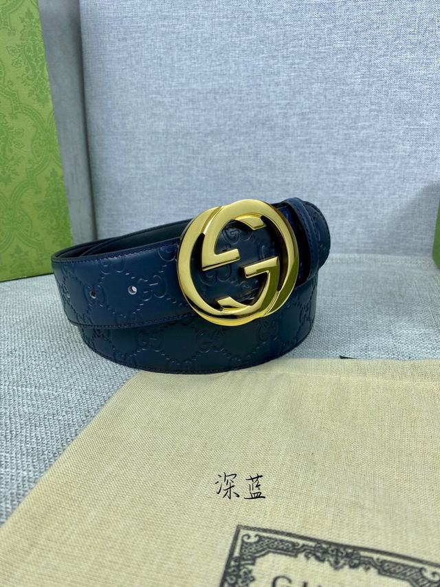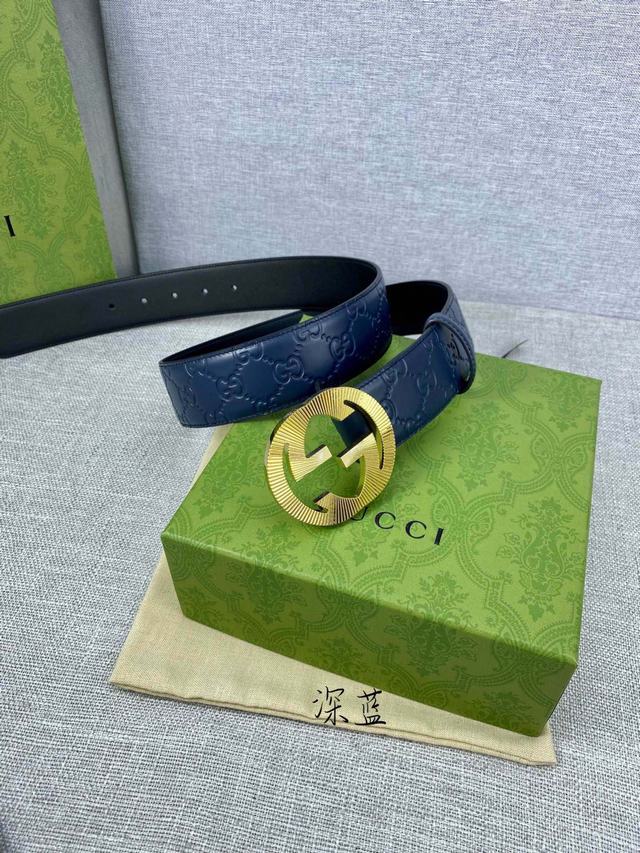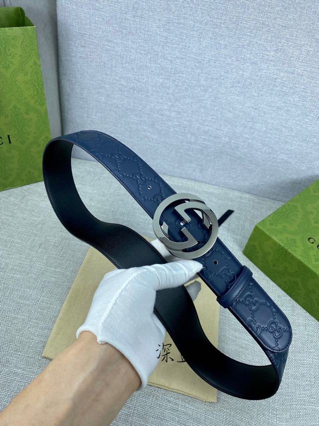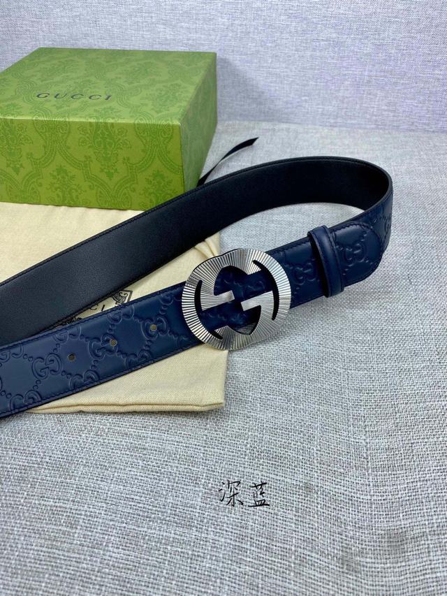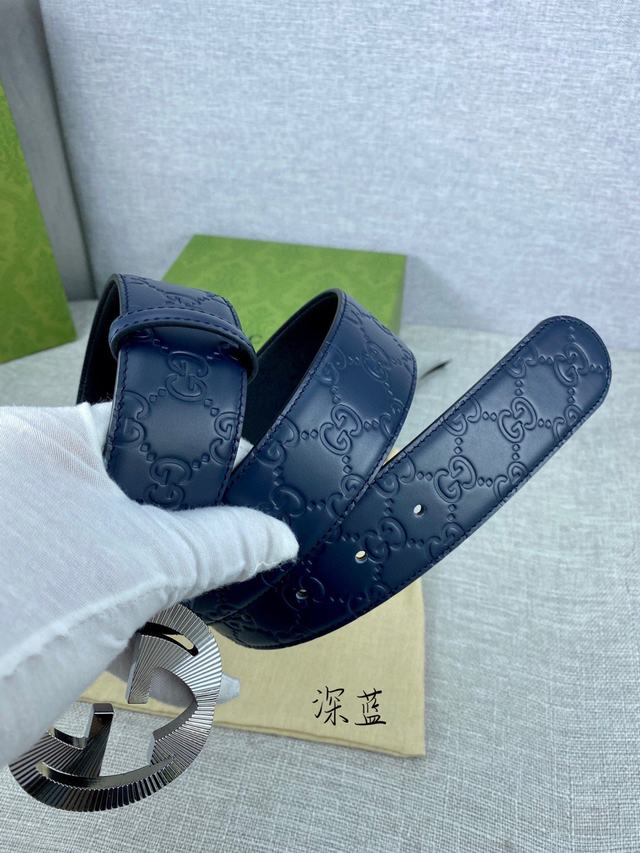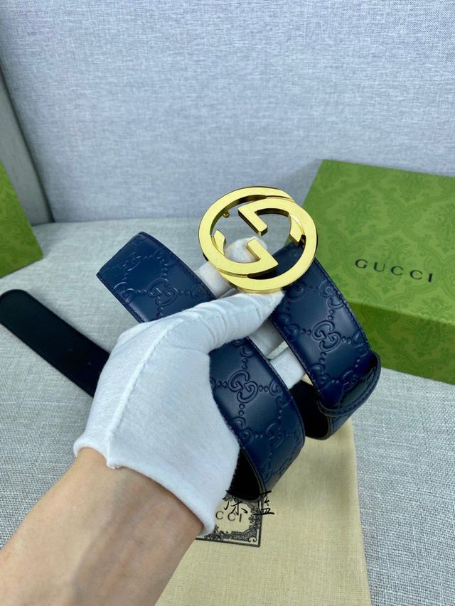 配全套包裝 寬度4.0cm GUCCI 互扣式雙G帶扣腰帶,採用熱壓印技術的Gucci Signature藍色皮革精制而成,觸感厚實,印花圖案清晰分明。