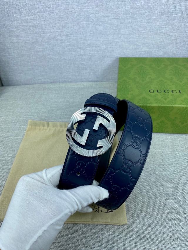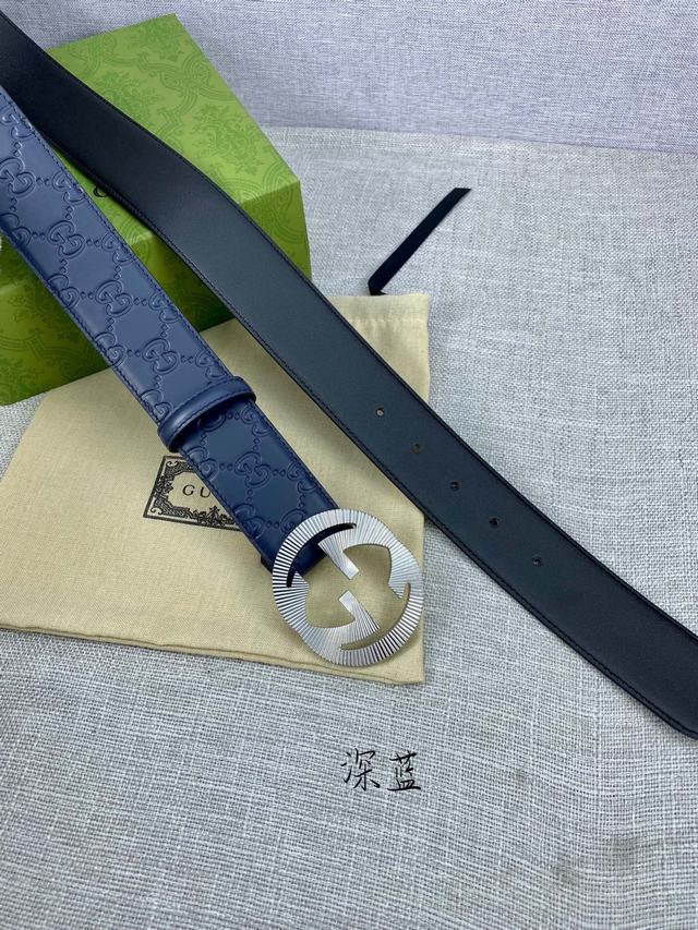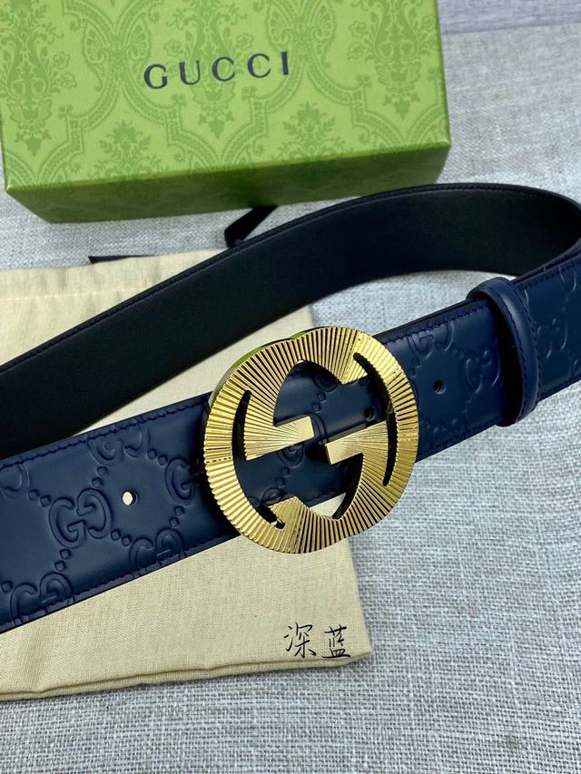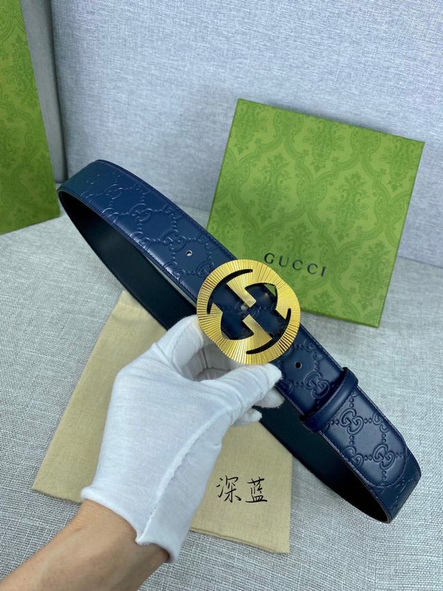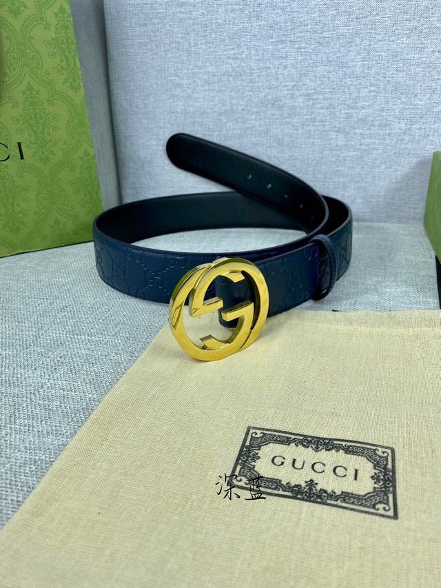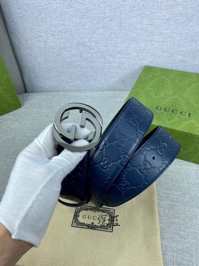 配全套包裝 寬度4.0cm GUCCI 互扣式雙G帶扣腰帶,採用熱壓印技術的Gucci Signature藍色皮革精制而成,觸感厚實,印花圖案清晰分明。