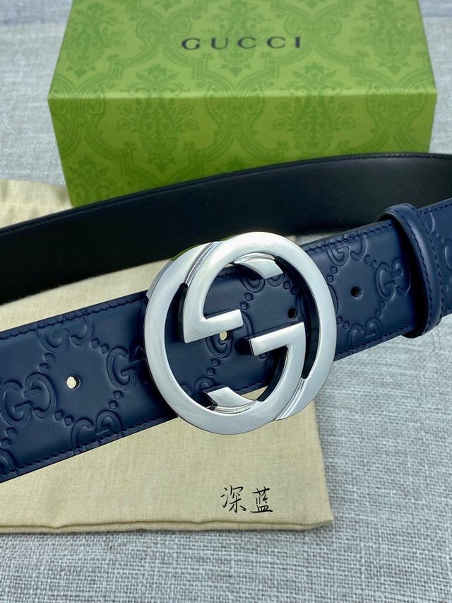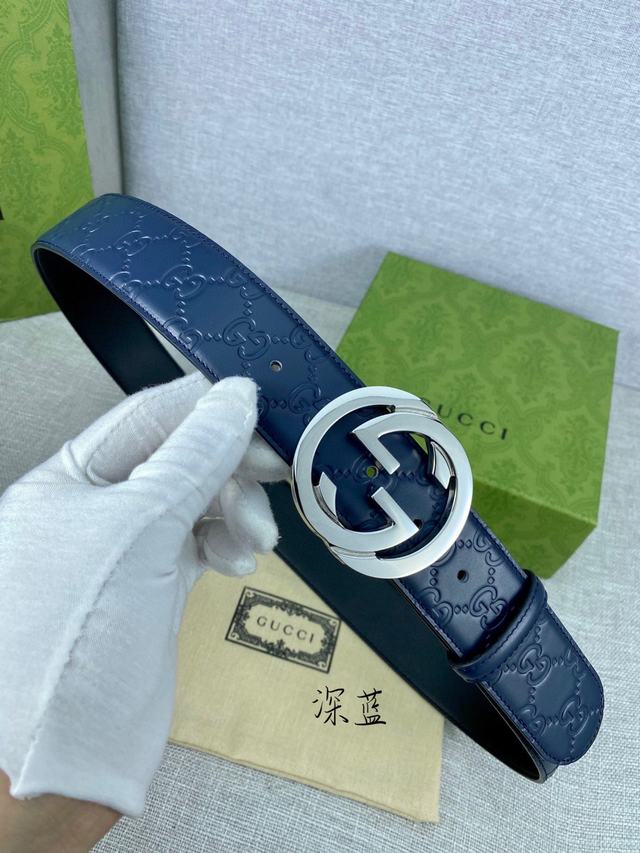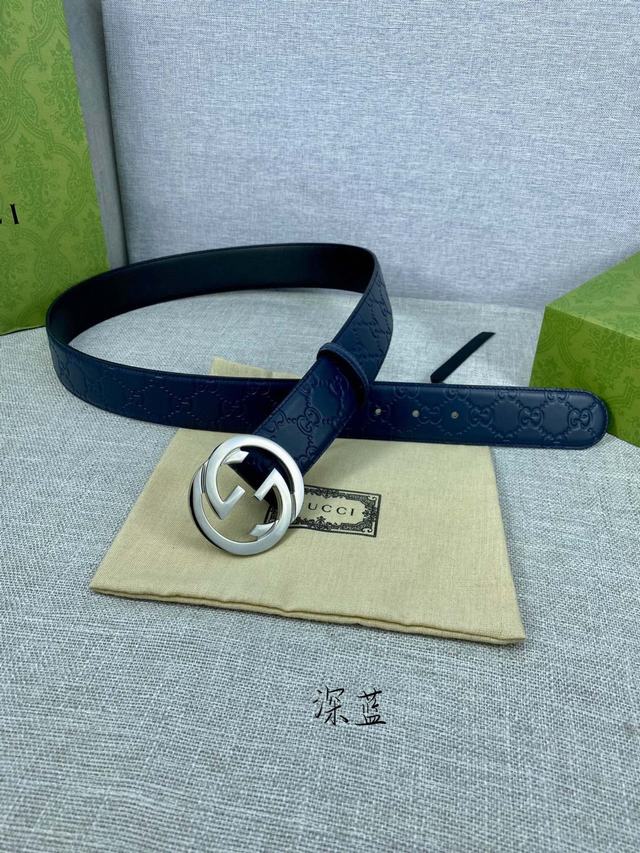 配全套包裝 寬度4.0cm GUCCI 互扣式雙G帶扣腰帶,採用熱壓印技術的Gucci Signature藍色皮革精制而成,觸感厚實,印花圖案清晰分明。號碼b041240