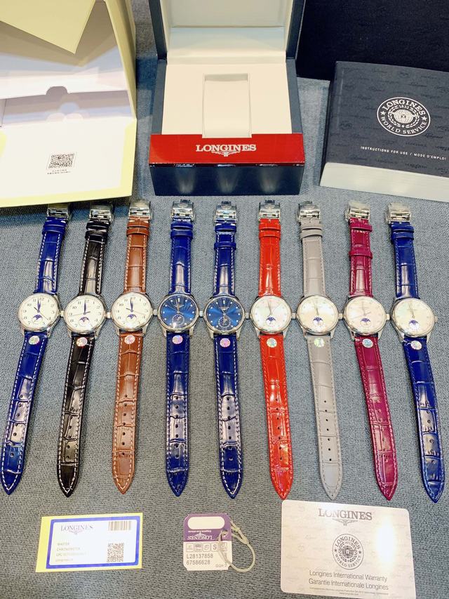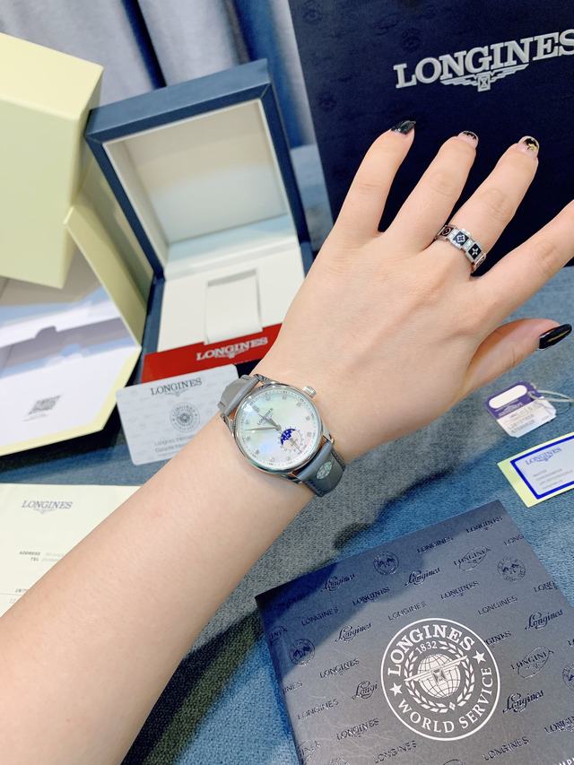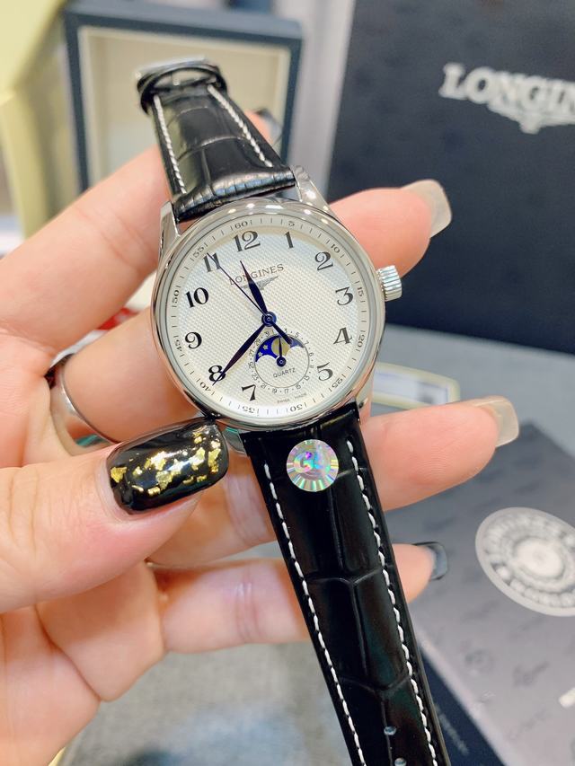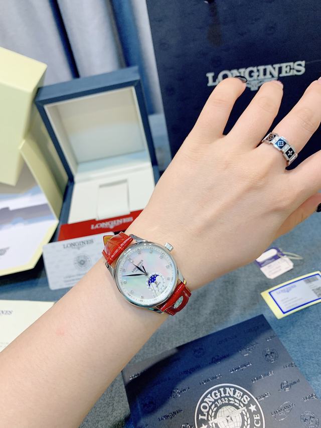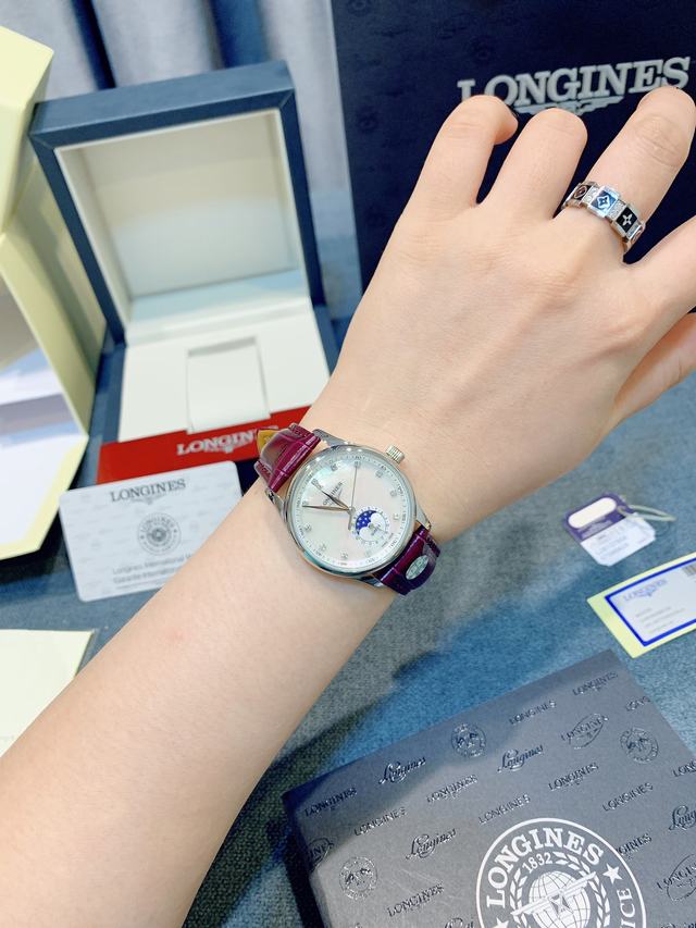 【赵丽颖同款】Longines浪琴 名匠系列女士腕表。全新浪琴名匠月相腕表系列。 诠释女性高贵典雅。精钢表壳直径:34毫米尺寸。官方一致6字位月相1-31日期显示功能。进口石英机芯。三码合一。采用进口头层牛皮、原装蝴蝶扣。珍珠母贝表盘在女表中是运用较多的元素,浪琴为其搭配了12颗钻石时标,将女性魅力发挥到极致。盘面6点钟位置的小表盘显示月相和日期,兼顾实用性和浪漫感,精巧别致。字表盘扫描打版,颜色、“麦粒”格纹深浅、内影字体大小粗细与正品完全一致。三码合一认准编号67586628    號碼062450