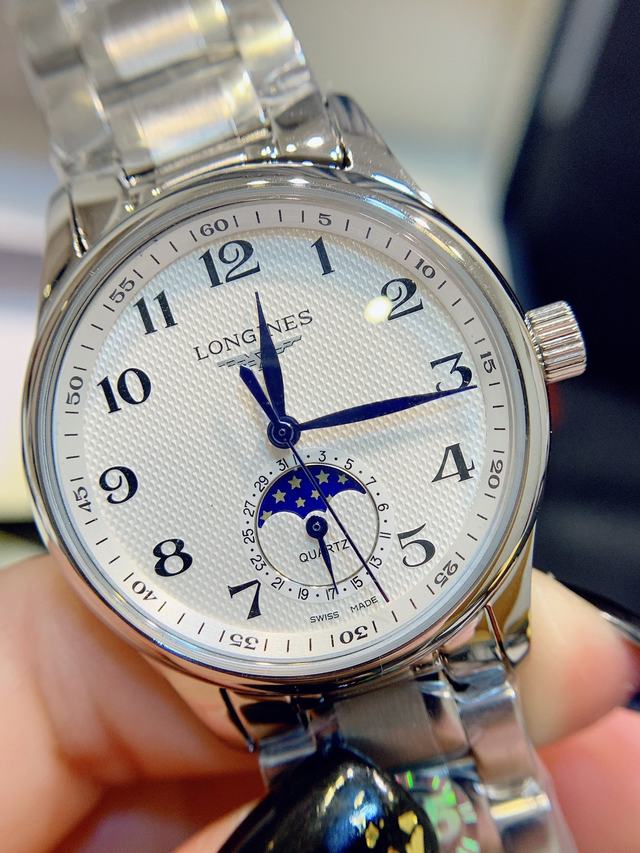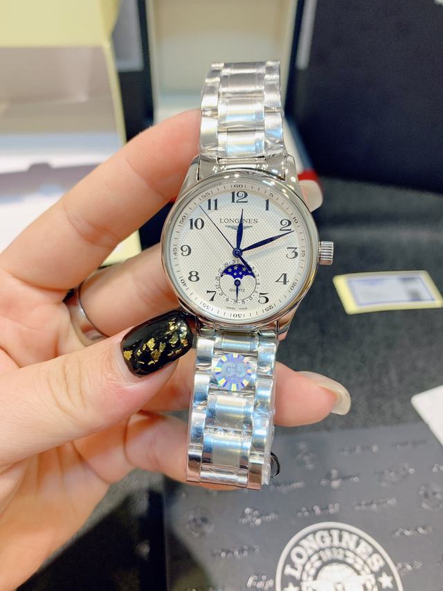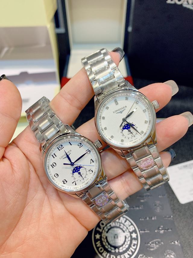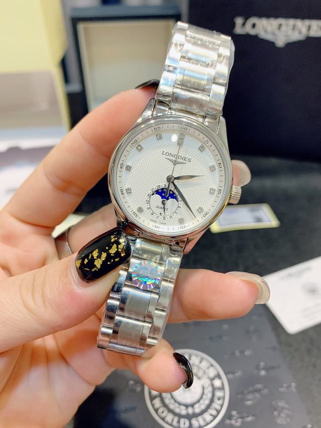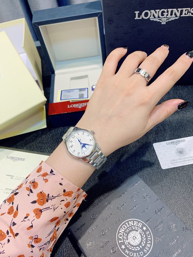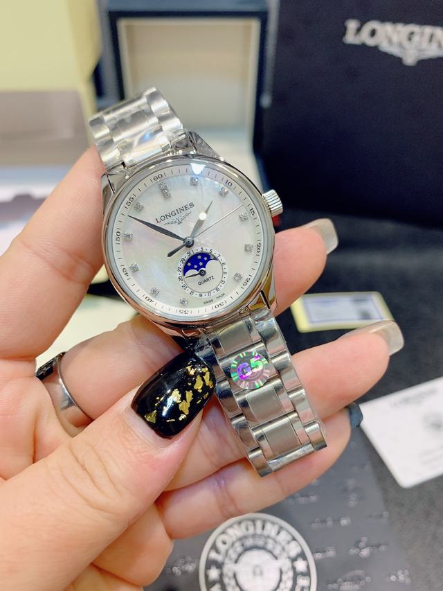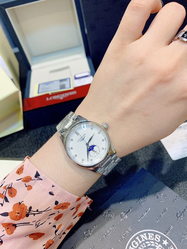 【赵丽颖同款】Longines浪琴 名匠系列女士腕表。钢带皮带统一价格。480金➕20。全新浪琴名匠月相腕表系列。 诠释女性高贵典雅。精钢表壳直径:34毫米尺寸。官方一致6字位月相1-31日期显示功能。进口石英机芯。三码合一。采用进口头层牛皮、原装蝴蝶扣。珍珠母贝表盘在女表中是运用较多的元素,浪琴为其搭配了12颗钻石时标,将女性魅力发挥到极致。盘面6点钟位置的小表盘显示月相和日期,兼顾实用性和浪漫感,精巧别致。字表盘扫描打版,颜色、“麦粒”格纹深浅、内影字体大小粗细与正品完全一致。 三码合一认准编号67586628 號碼062480