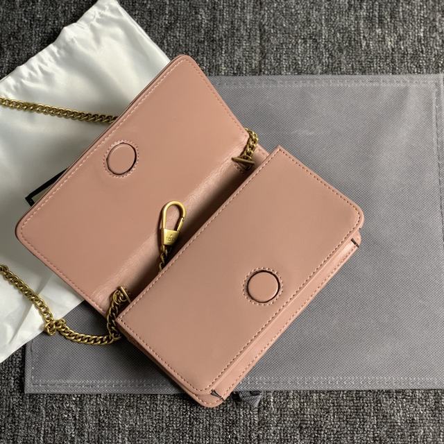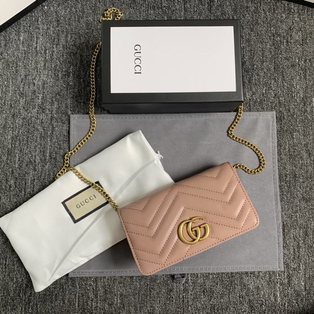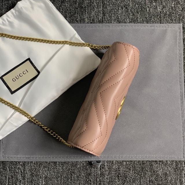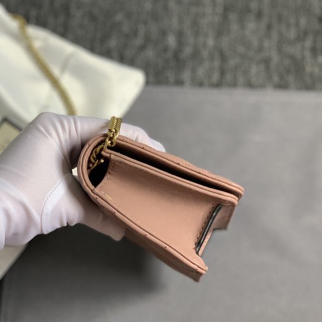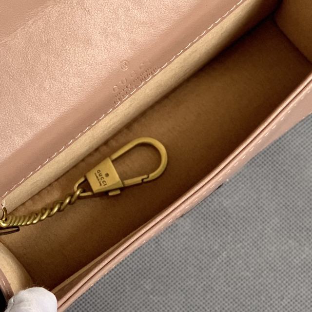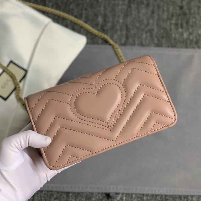 GG Marmont迷你链条包,采用绗缝真皮,配以人形花纹设计和心形图案 经典双G logo很有辨识度 磁吸开合设计很方便 包包虽小 容量很🉑️噢~