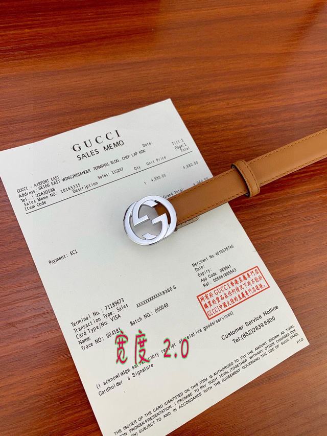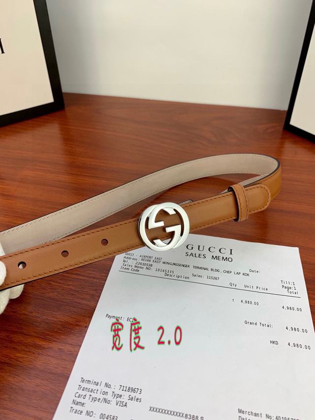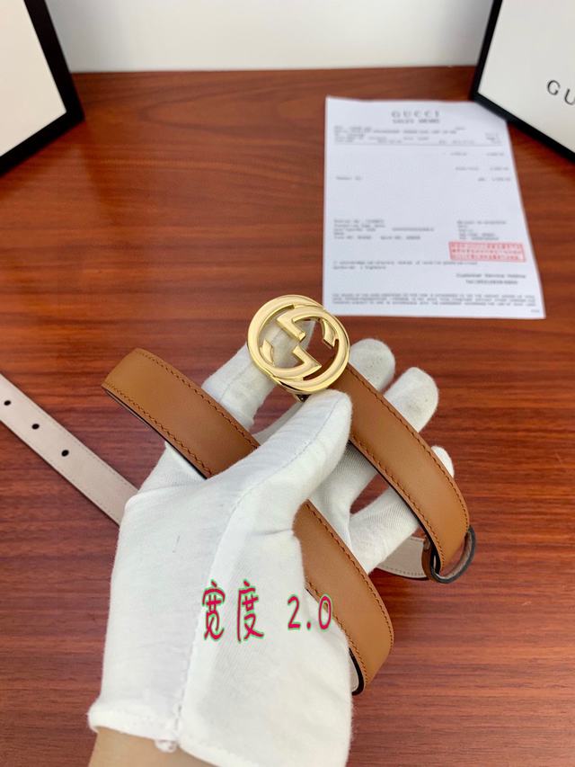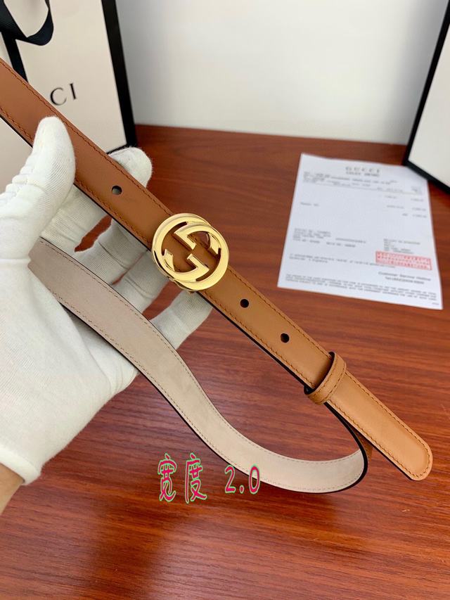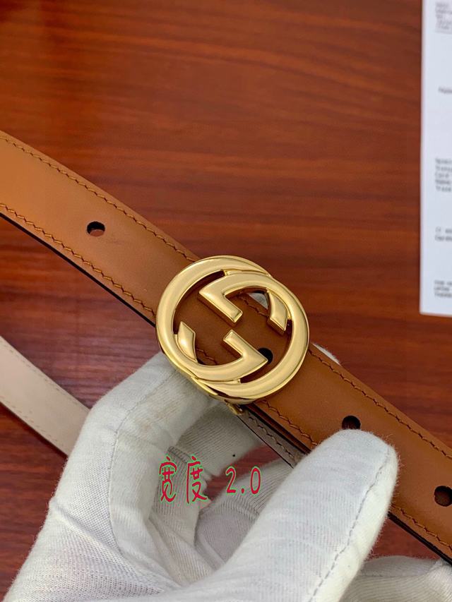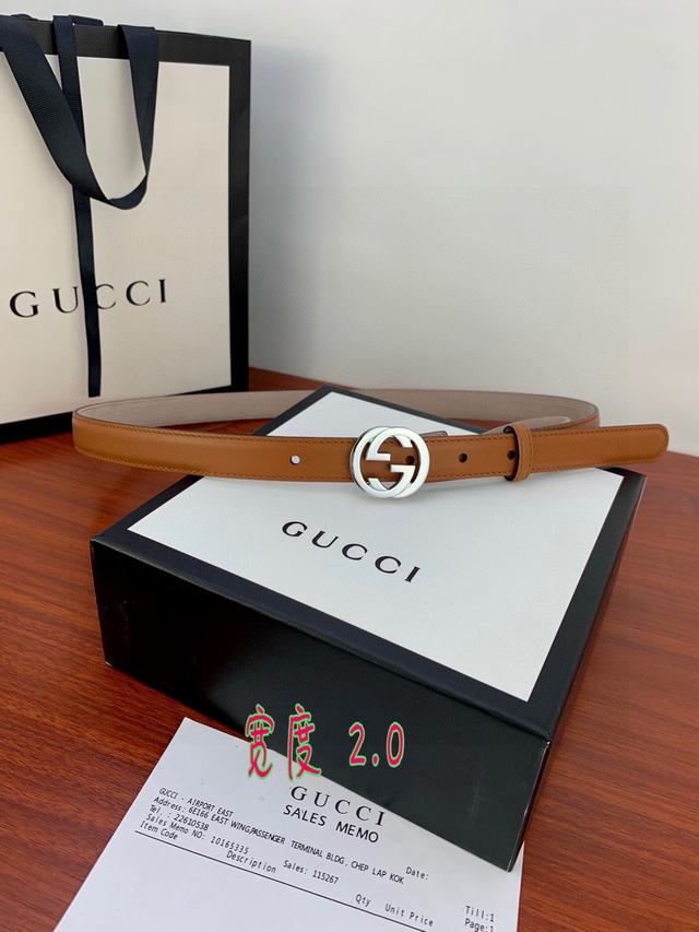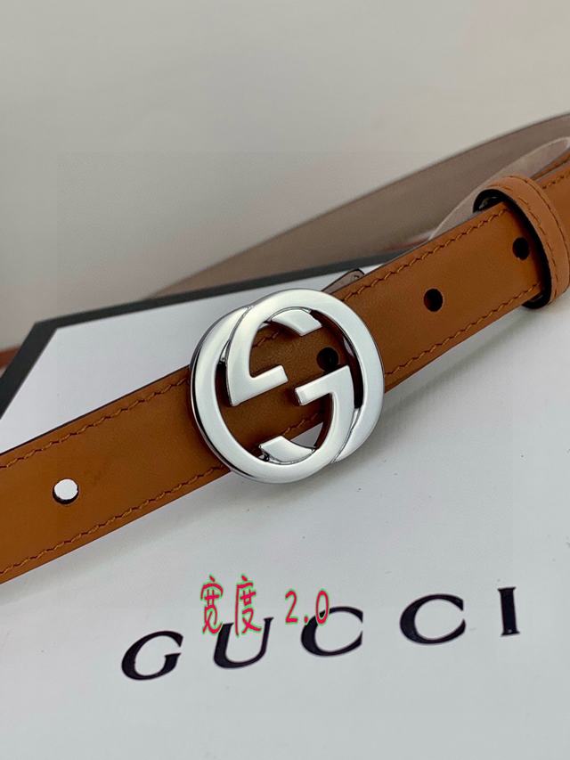 (女款)配全套包装 宽度2.0cm G U C C I 此细款腰带用采光头小层牛皮 精制而成,配以金/银/枪色双G带扣。号码b021220