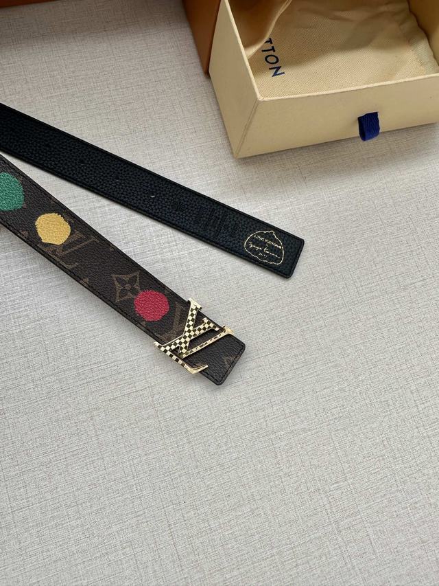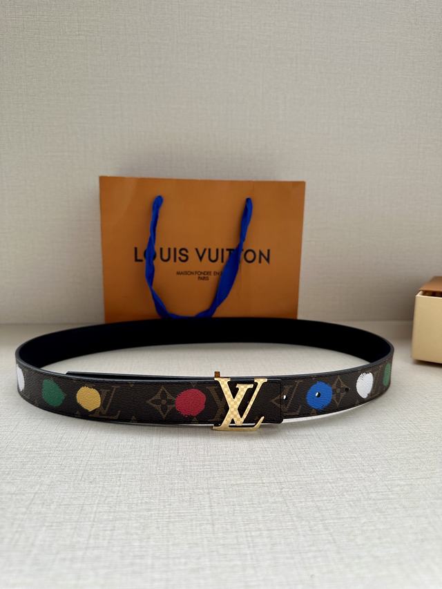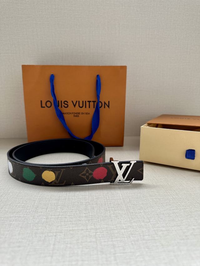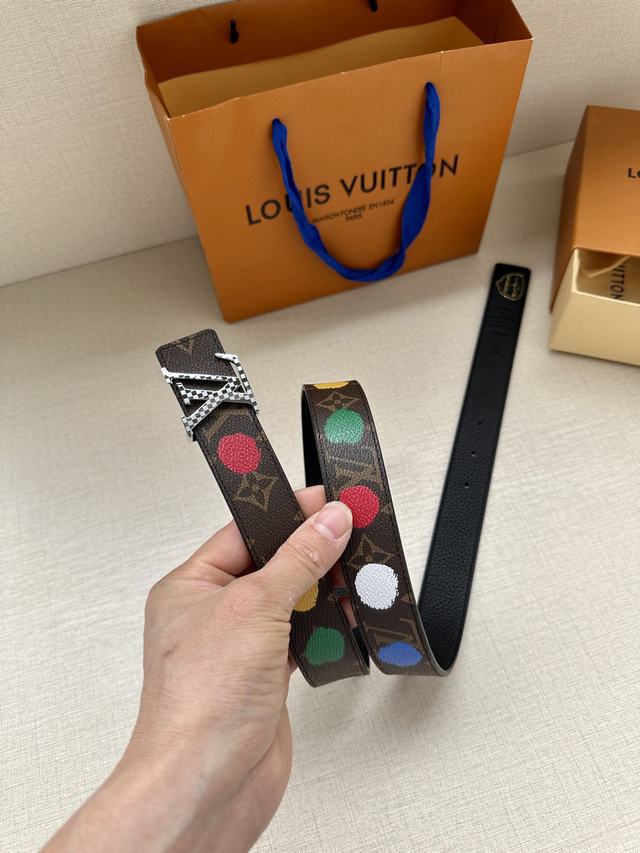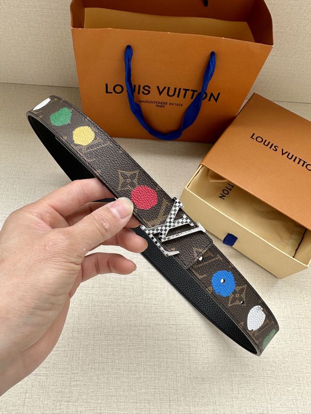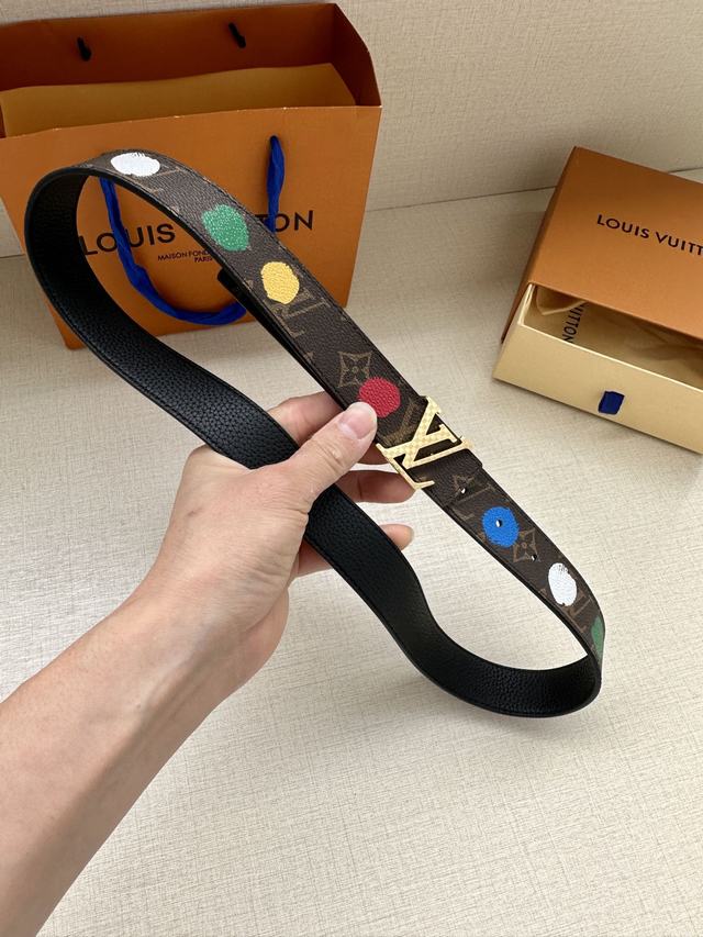 配全套包装 LV x YK LV Initiales Painted Dots 双面腰带出自路易威登 x 草间弥生合作系列,将这位日本艺术家的经典波点复现于 Monogram 帆布之上,恰似手工绘制一般。翻转可见素净皮革,搭配抛光 LV 字母搭扣   号码b041240