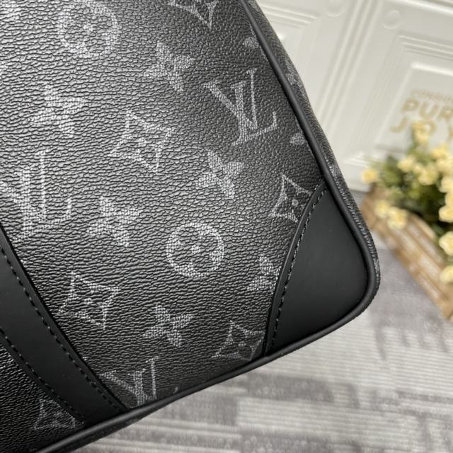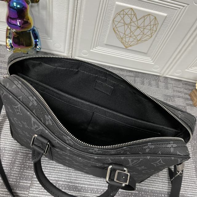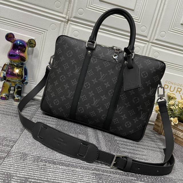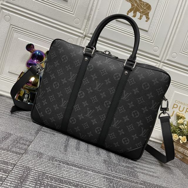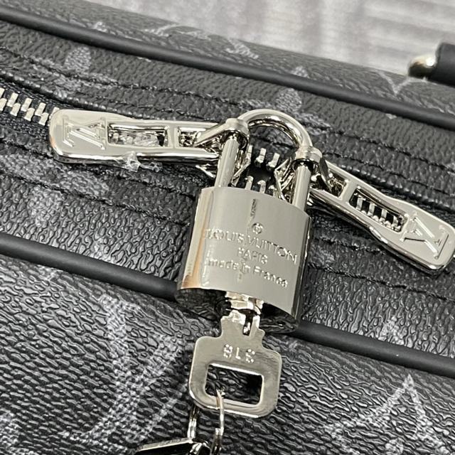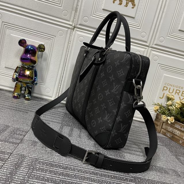 M30925  黑花、老花、黑格、壓格、十字紋 男士公文包系列 本款 Voyage 小號公文包 取材 Damier Graphite 塗層帆布,搭配皮革側帶、加固包角、頂部手柄和名牌。外袋便於存放智能手機,加墊內隔層可容納 13 寸筆記本電腦,可拆卸並調節的肩帶實現舒適肩背。詳細特征36.5 x 27.5 x 6 厘米