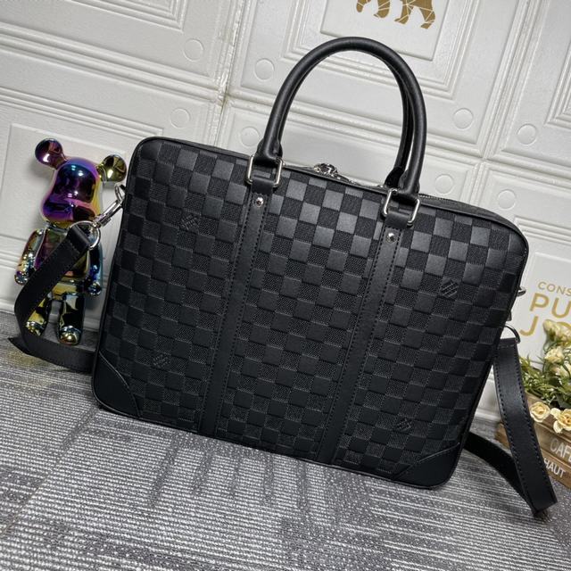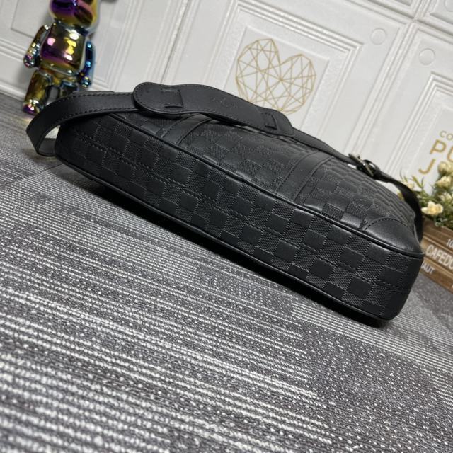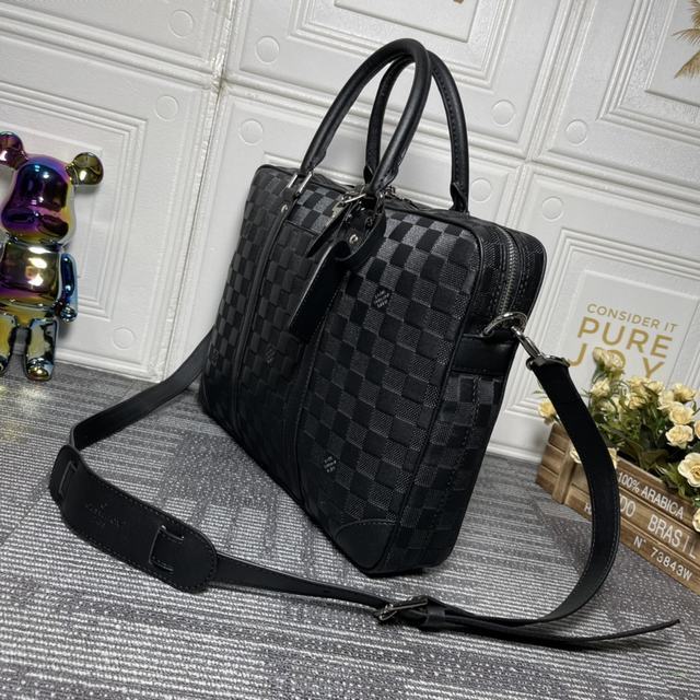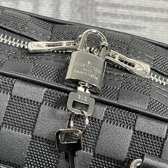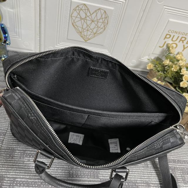 M30925  黑花、老花、黑格、壓格、十字紋 男士公文包系列 本款 Voyage 小號公文包 取材 Damier Graphite 塗層帆布,搭配皮革側帶、加固包角、頂部手柄和名牌。外袋便於存放智能手機,加墊內隔層可容納 13 寸筆記本電腦,可拆卸並調節的肩帶實現舒適肩背。詳細特征36.5 x 27.5 x 6 厘米