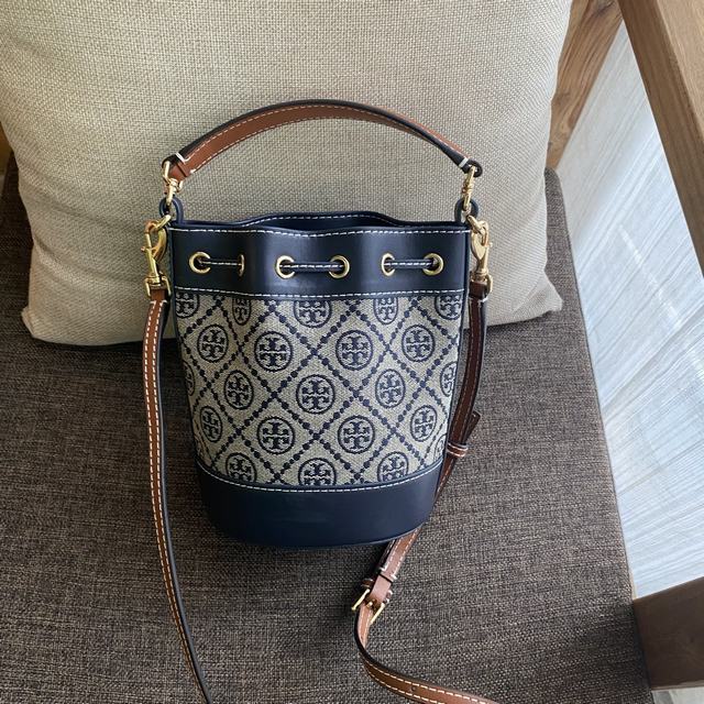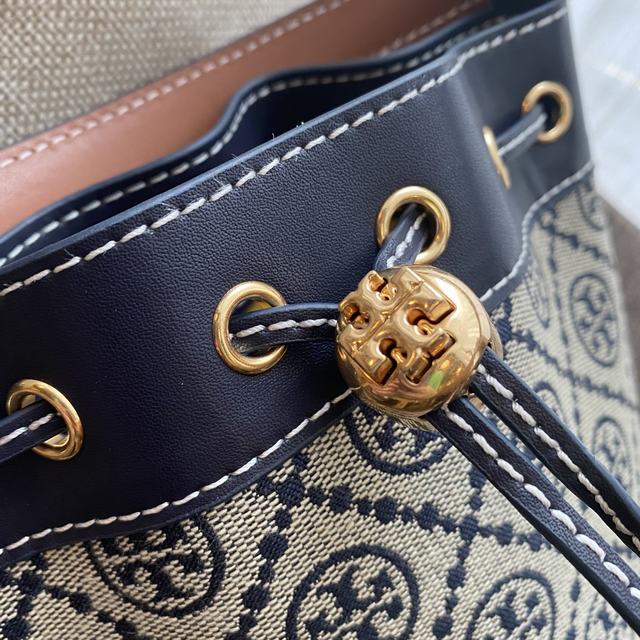 大號TORY BURCH Monogram 2021夏季新抽繩水桶包 質感海軍藍帆布面料搭配利落包身,復古提花的點綴,讓整體造型更加休閑有範。