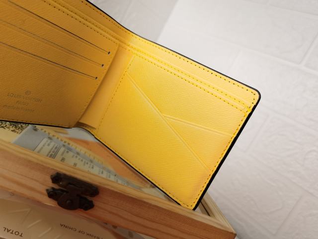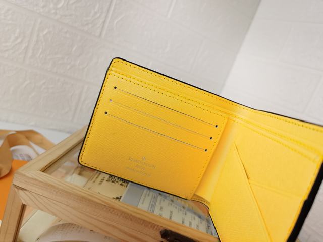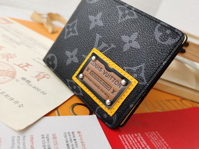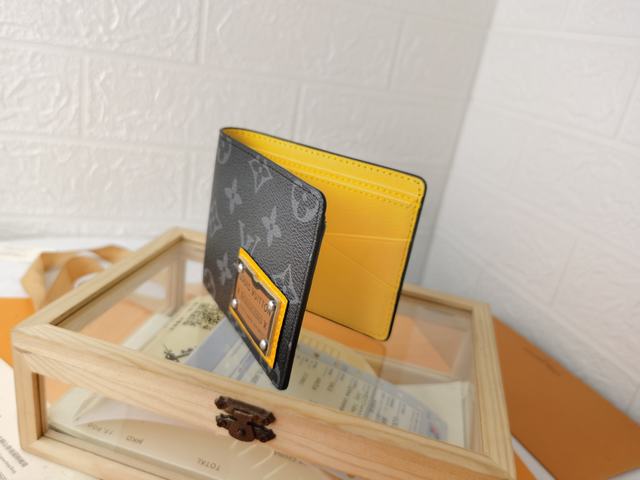 頂級原版💎【實物拍攝 自家背景】M60895黑花/黃色 Multiple 錢夾屬於 Gaston Labels 限量版系列,由 Monogram Eclipse 塗層帆布製成,飾有的壓紋皮革貼飾借鑒路易威登之孫 Gaston-Louis Vuitton 收藏的復古行李標簽設計。此款實用錢夾含多個口袋和卡槽,小巧纖細。尺寸:11.5 x 9.0 x 1.5cm