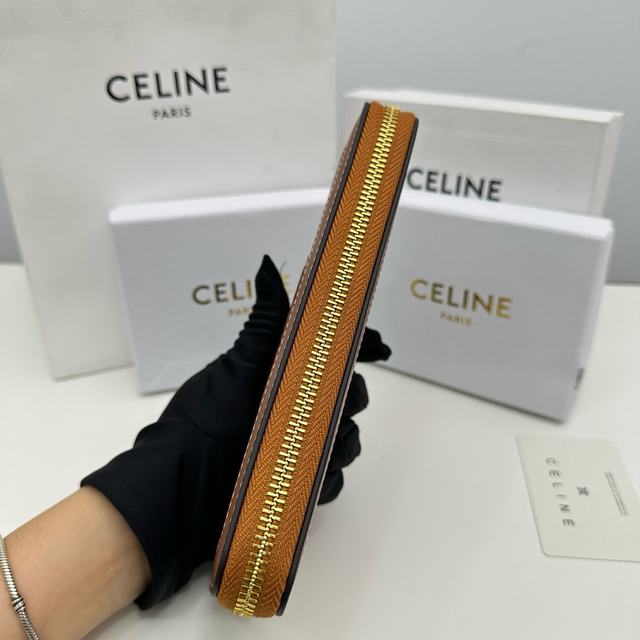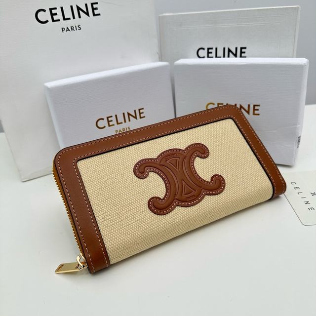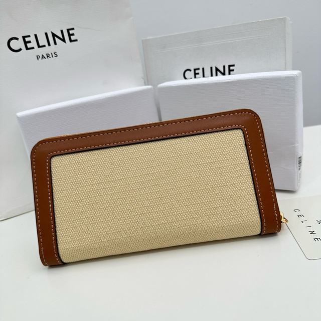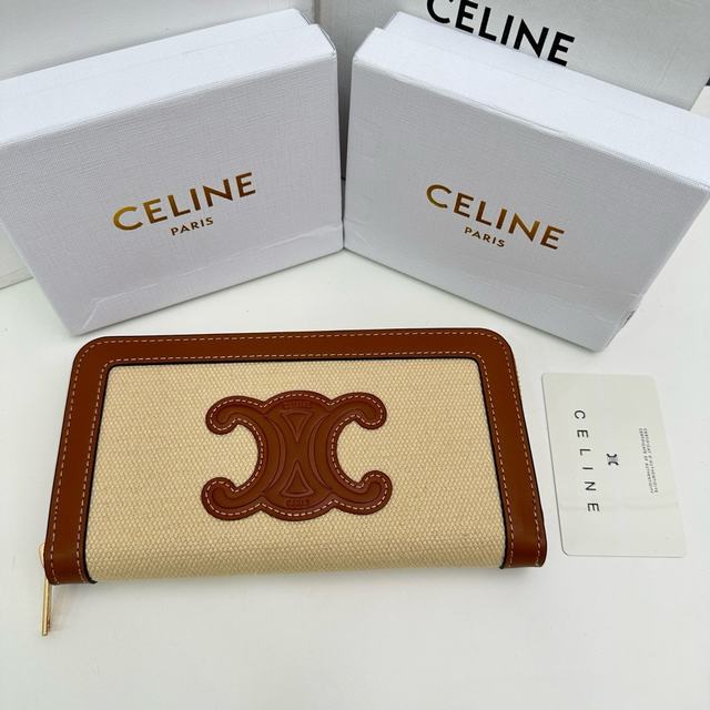 品牌:Celine A17🎀顏色: 白色帆布🎀尺寸: 19*10.5*3.5🎀說明: Celine 專櫃同步,TRIOMPHE CUIR大拉鏈錢夾,織物和小牛皮天然/棕褐色織物,小牛皮襯裏飾邊拉鏈封口兩個扣板隔層十二個信用卡槽一個拉鏈口袋兩個扁平口袋!號碼021180