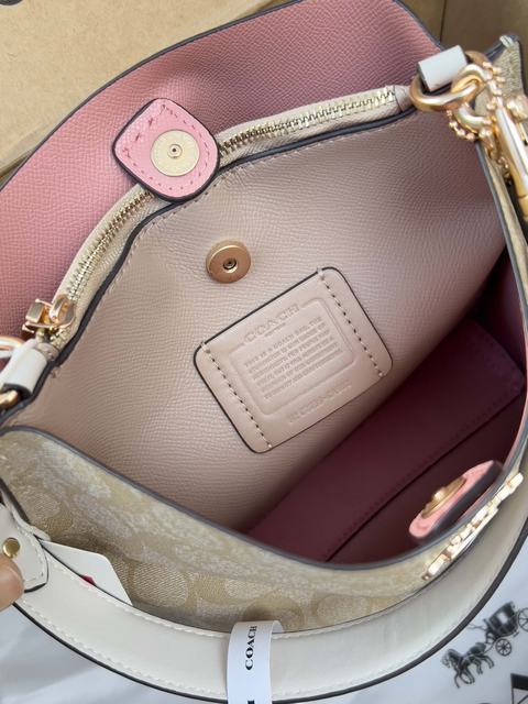 《配图片包装》》 蔻驰最新款Mollie系列水桶包小号,定制PVC老花料配牛皮材质,质感超好,做工精致,配有可拆卸长短两条肩带,可手提可斜挎,包包中间还有拉链隔层,容纳性 私密性 都很好,包身扁平上身更加服帖,火热款简单不花俏,百搭唯美能装容量大,自留款!