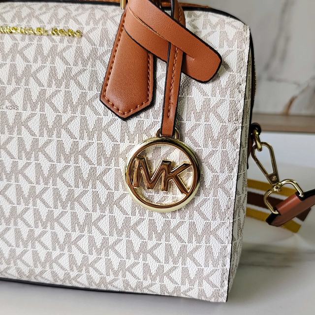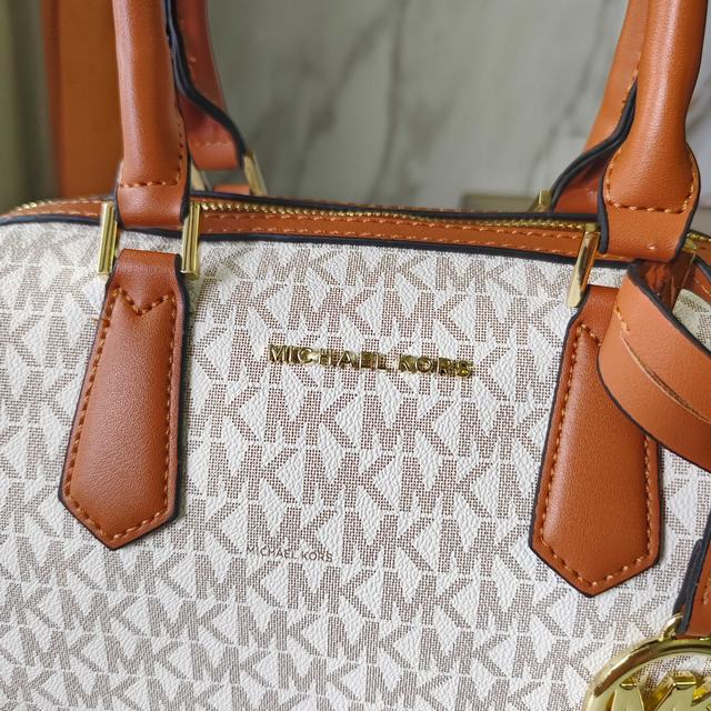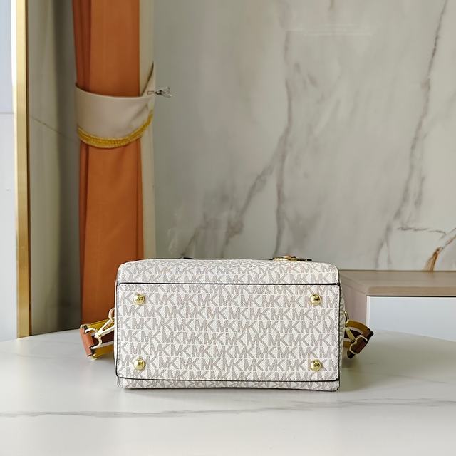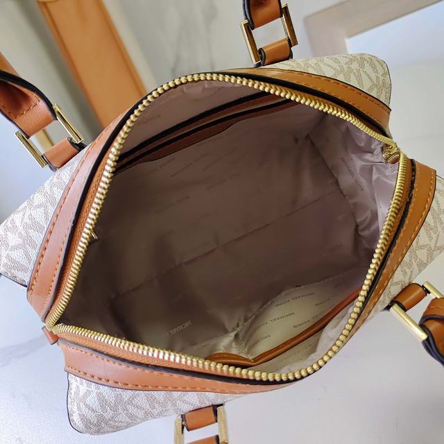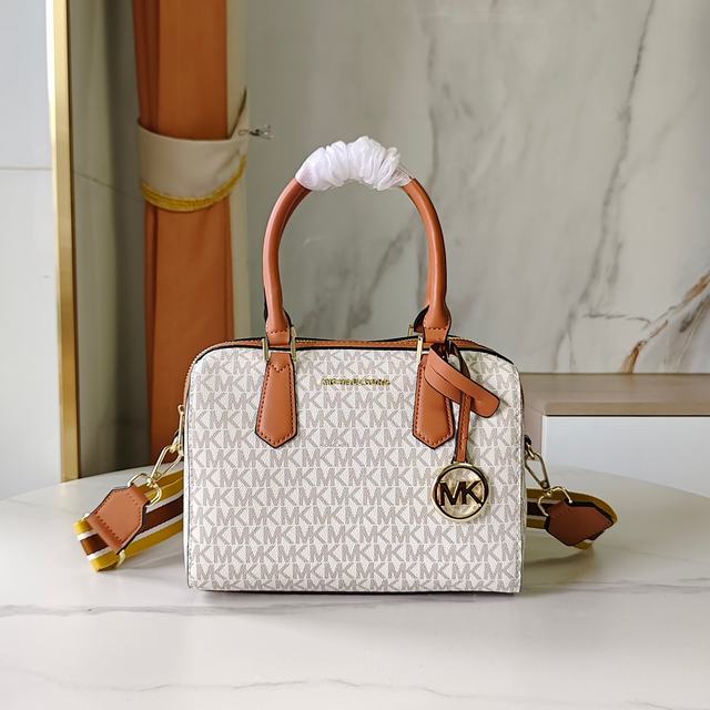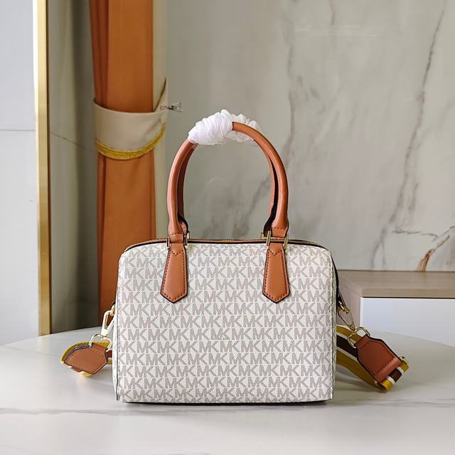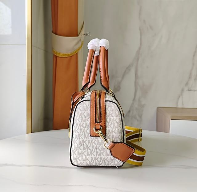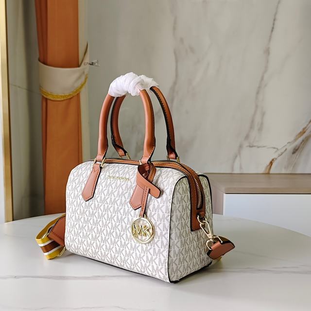 MK新款pvc拼皮波士顿枕头包,布宽肩带,经典的品牌印花logo图案分布包身,品牌代表性字母五金吊牌悬挂点缀,可以手提可以斜挎解锁不同的搭配模式,大容量内存,双色可选,满足不同的搭配造型。尺寸约24/13/17,型号:71012