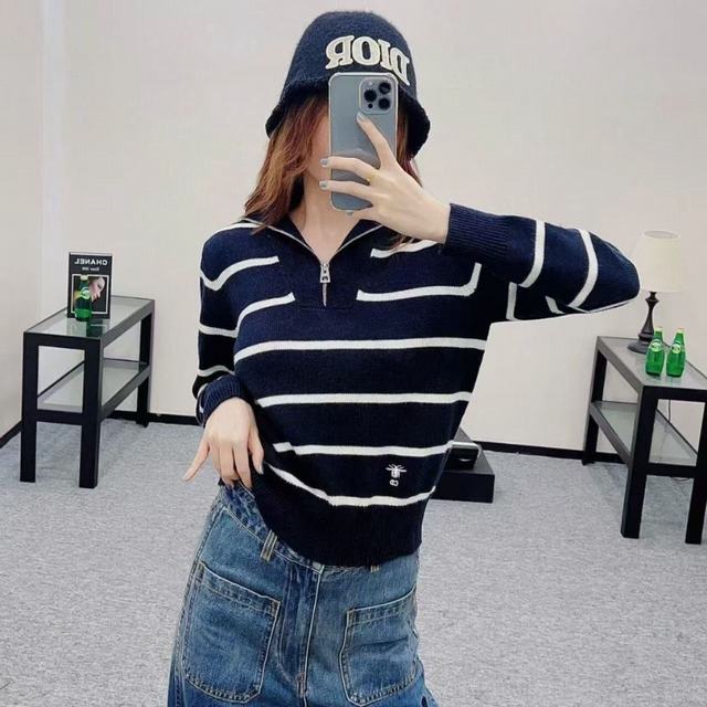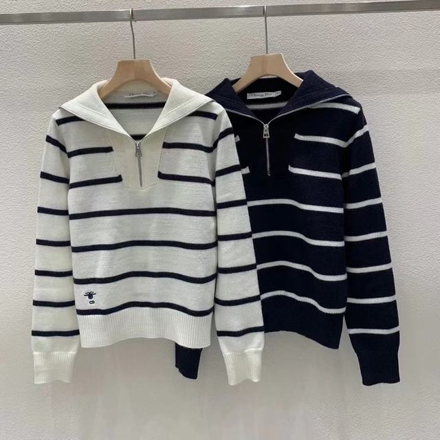 条纹秋冬季拉链外穿毛衣长袖新款慵懒宽松翻领针织衫上衣打底