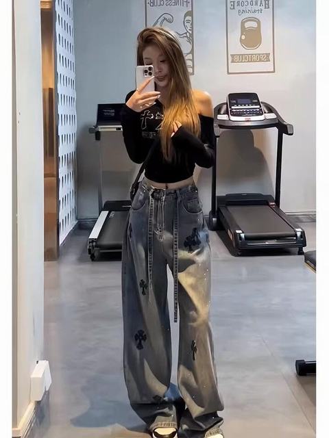美式2025年秋季新款燙鉆滿天星十字架直筒牛仔褲女高腰顯瘦闊腿褲